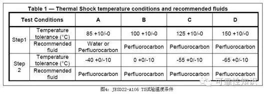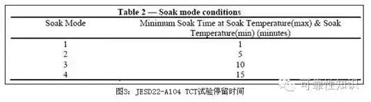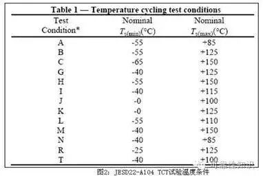 JEDEC原為美國電子工業(yè)協(xié)會EIA之下屬團體,現(xiàn)已獨立出來成為IC封裝業(yè)的專門組織,曾就有機IC載板與半導體成品之品檢與可靠度試驗訂定許多規(guī)范,其涉及到溫度循環(huán)方面最常見的兩個試驗如下: TCT:參考標準JESD22-A104E,兩箱式Air to Air溫度循環(huán)試驗(Temperature Cycling Test),共有13種高低溫匹配與4種留置時間CycleTime(1、5、10、15分鐘)的級別對應,以供用戶參考,如下圖2和圖3所示: