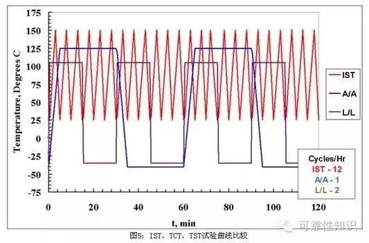 TST:參考標準JESD22-A106B,兩槽式Liquid to Liquid高低溫液體中之循環(huán)試驗,特稱為ThermalShockTest熱沖擊試驗,試驗條件如下圖4所示: 不管是TCT或是TST試驗,其試驗時間都是很長的,而IST時間明顯小于TCT和TST,常見的溫度循環(huán)測試曲線如圖5所示,由圖可以看出,液冷式的TST試驗,高低溫轉換速率是**的,IST其次,TCT最小,而高低溫轉換速率越大,其對材料的沖擊也隨之增加,也就更容易失效: IST試驗雖然試驗時間最短,但其也有不足之處,它的高低溫溫差是最小的,溫差決定了測試樣品的工作溫度范圍,溫差越大,代表樣品能工作在更高或更低的溫度,如圖6所示: